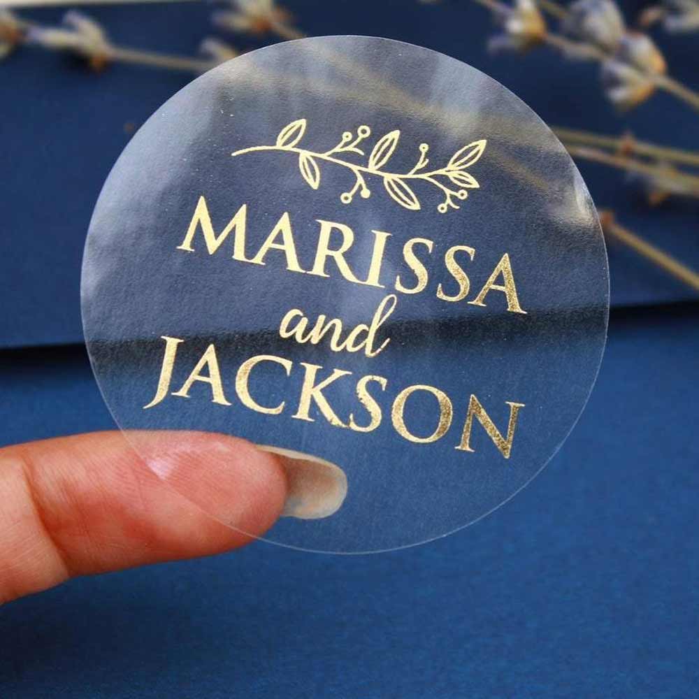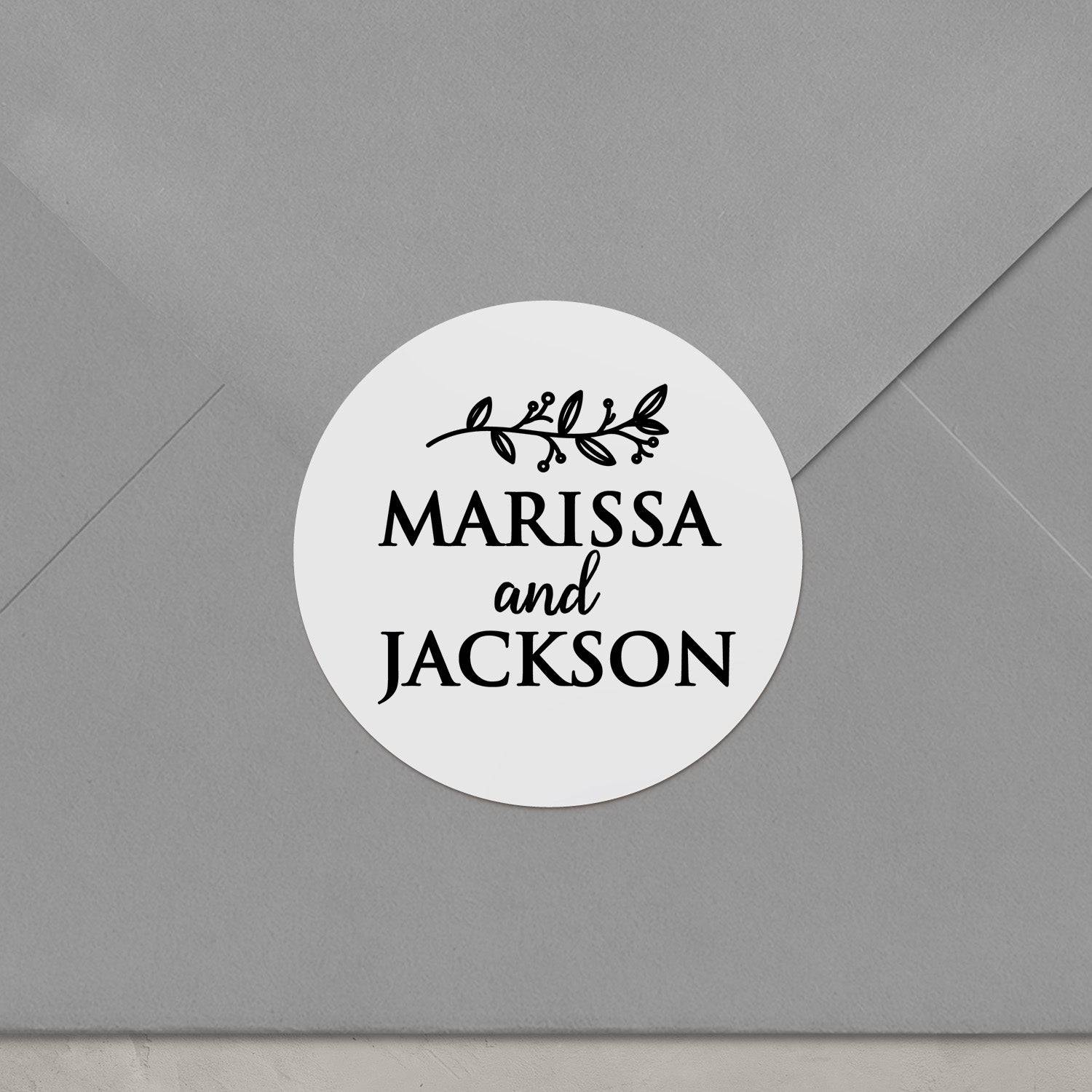 Personalize your wedding favors with these elegant Foliage Wedding Stickers, featuring your names in modern script with foil or classic print. Perfect for sealing envelopes, decorating treat bags, jars, or boxes, these custom labels add a timeless and natural touch to your celebration. Available in gold, rose gold, silver, or black print on clear or white easy pel & stick labels sheets