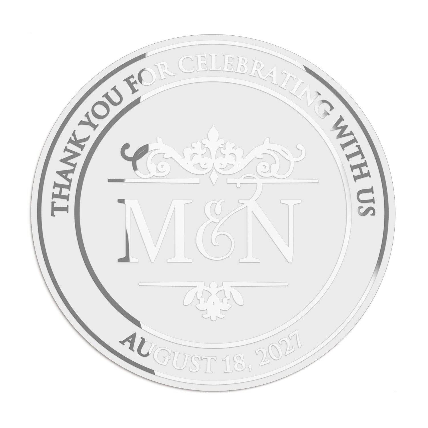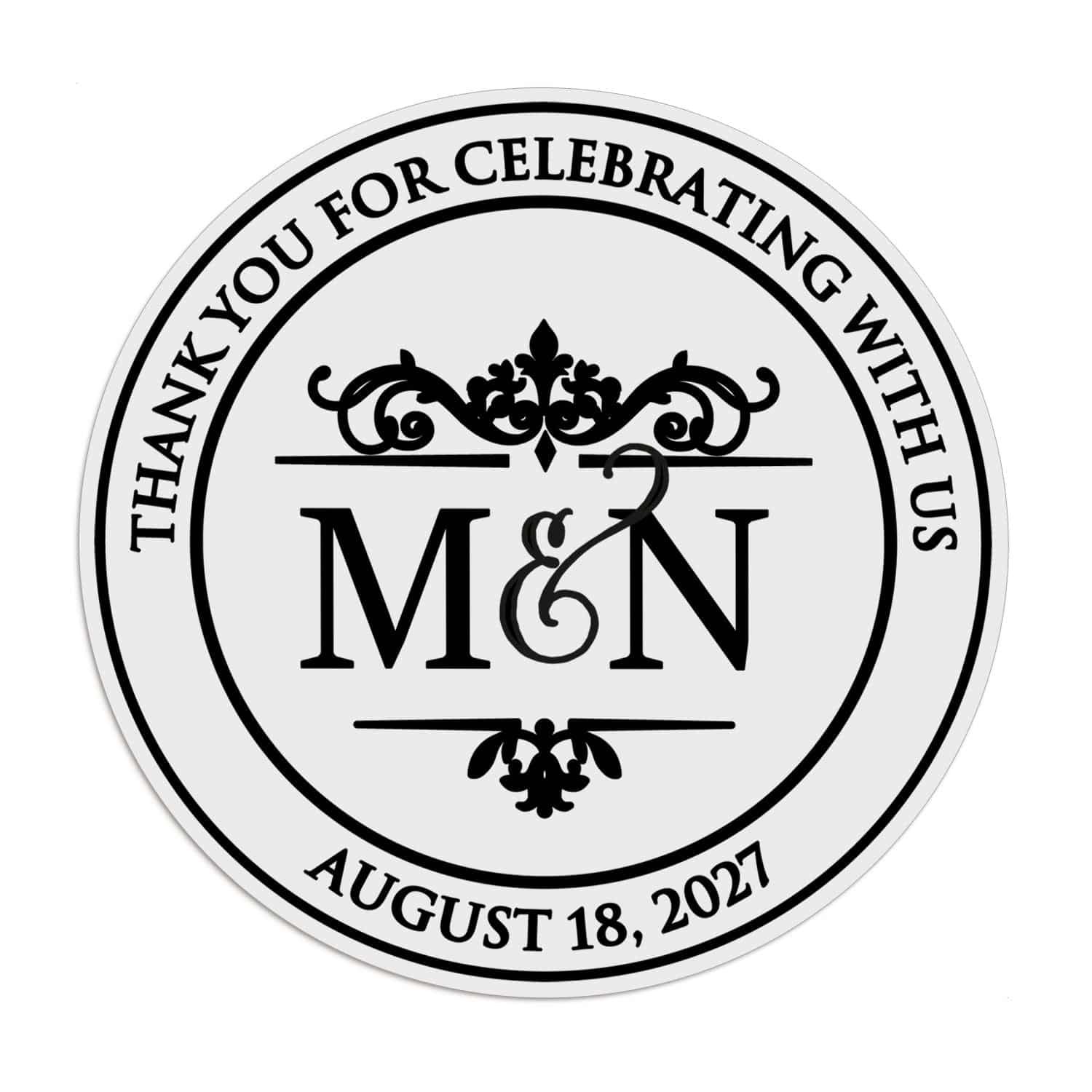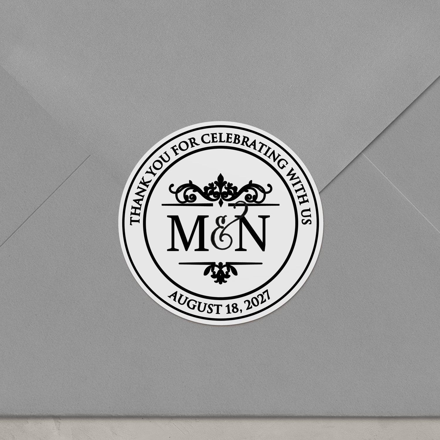 Celebrate your special day with these luxurious Royal Ornament Wedding Stickers featuring bold initials framed by a decorative flourish and classic circular border. Designed to add sophistication to wedding favors, invitations, thank you gifts, or dessert packaging, these custom labels create a timeless impression.