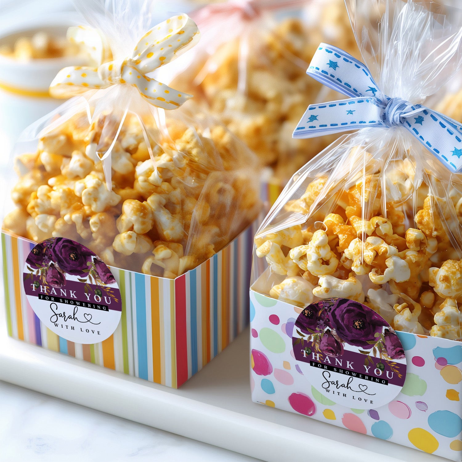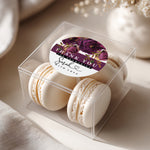 Elegant purple floral favor stickers featuring bold watercolor blooms and modern typography. Designed for bridal showers, weddings, baby showers, and party favors, these personalized stickers add a sophisticated touch to any event. Perfect for sealing favor bags, popcorn packs, macaron boxes, gift packaging, or envelopes, bringing a coordinated and stylish finish.
