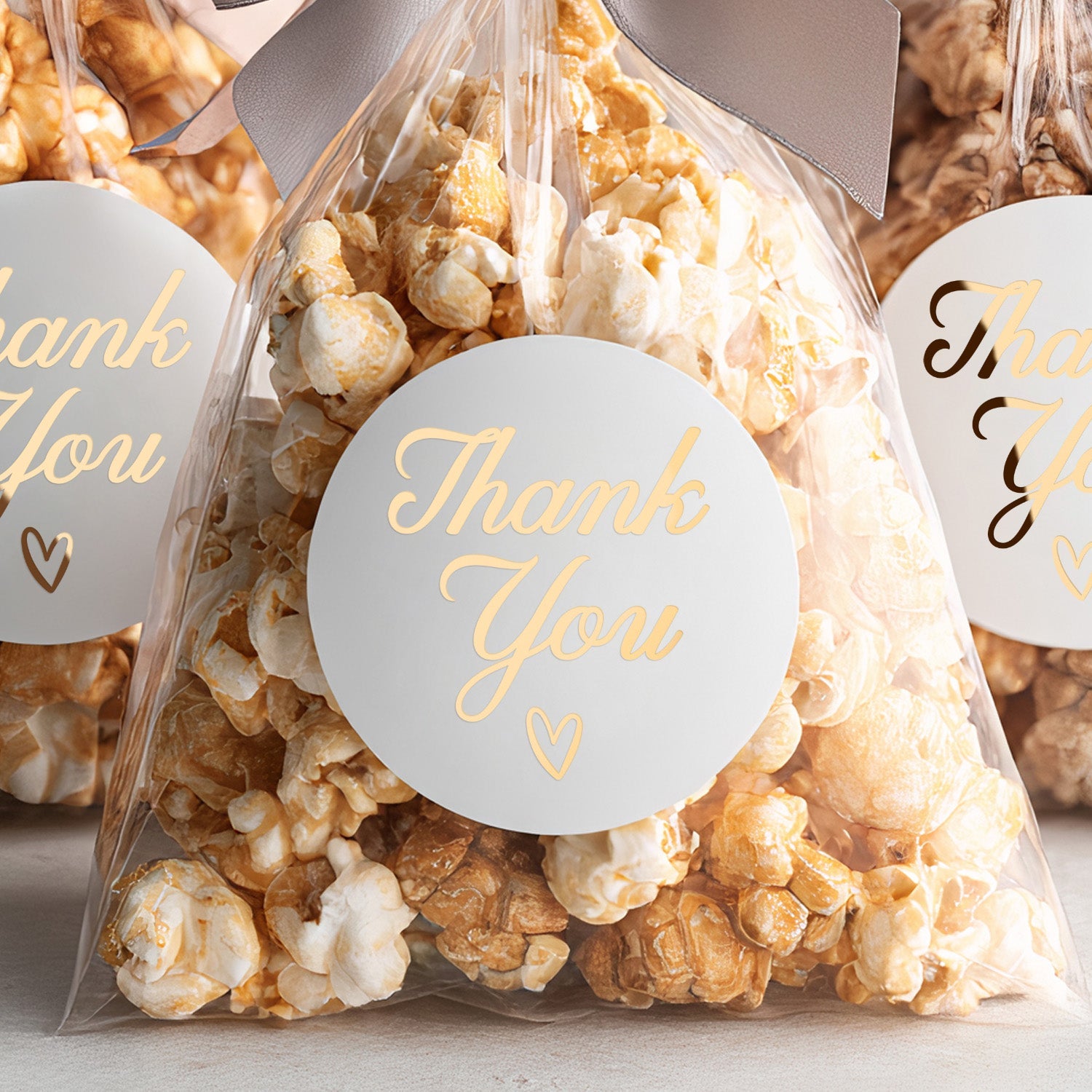 Elegant “Thank You” wedding favor stickers with a delicate heart detail. Perfect for sealing envelopes, favor bags, cookie packs, jars, or gift boxes, these personalized stickers add a warm and thoughtful finishing touch to your celebration.