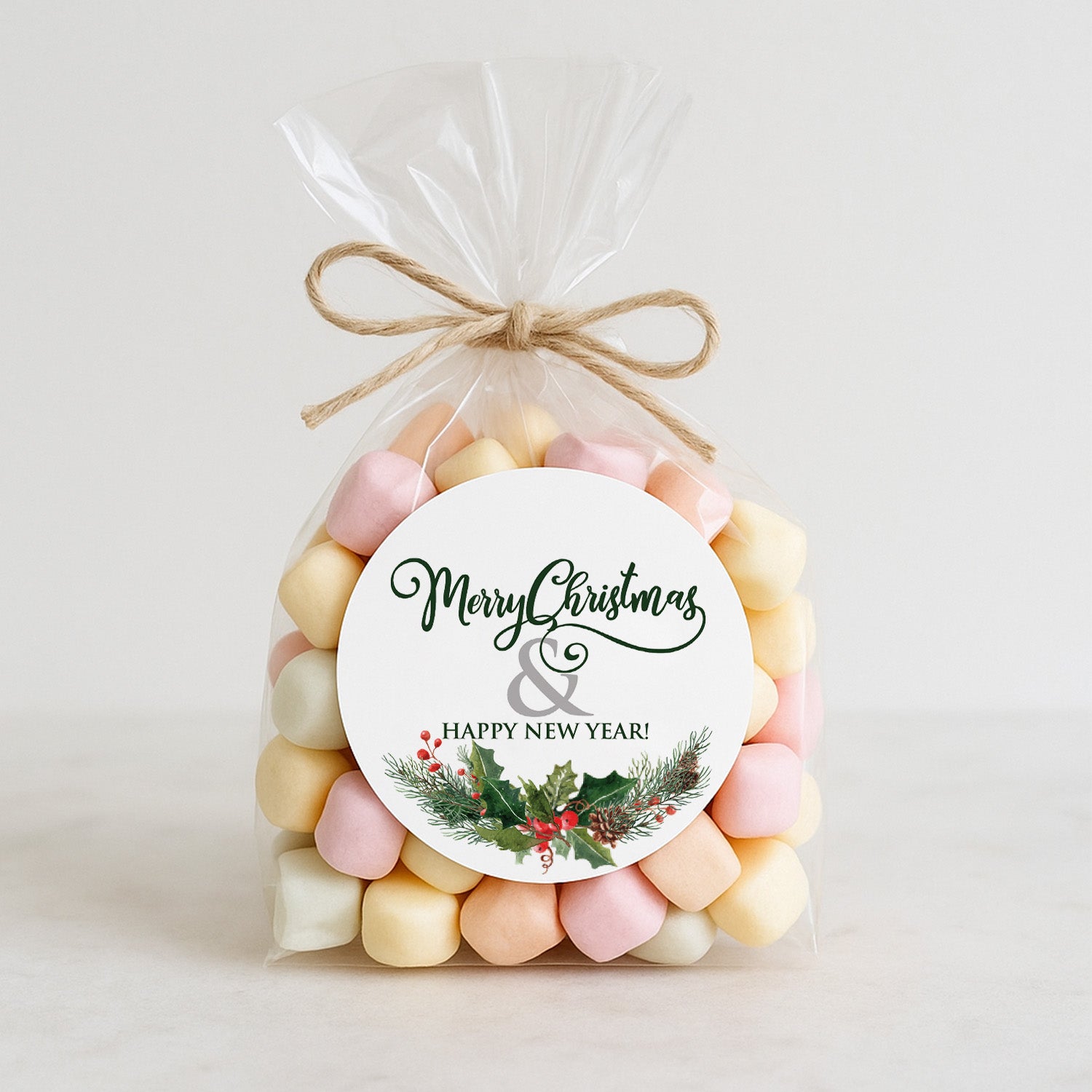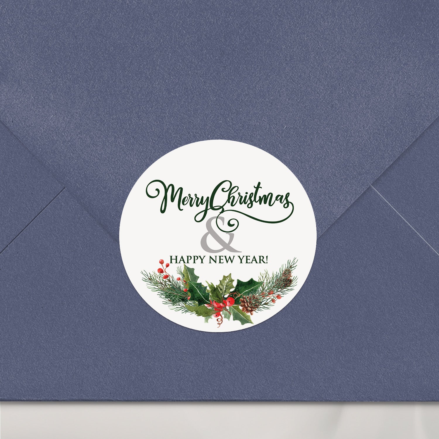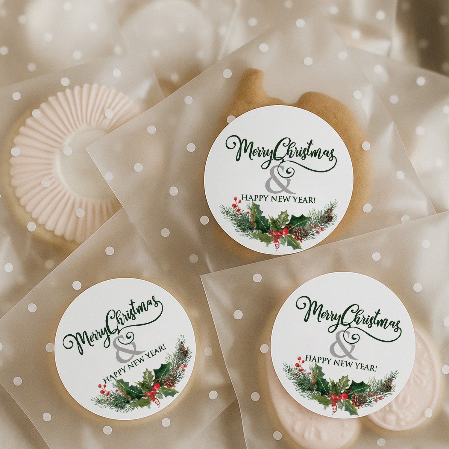 Festive Merry Christmas & Happy New Year stickers with holly, pine, and berry accents, perfect for sealing holiday gift bags, cookie packs, boxes, or envelopes. Add a cheerful seasonal touch to your packaging with these personalized holiday labels.