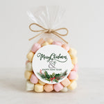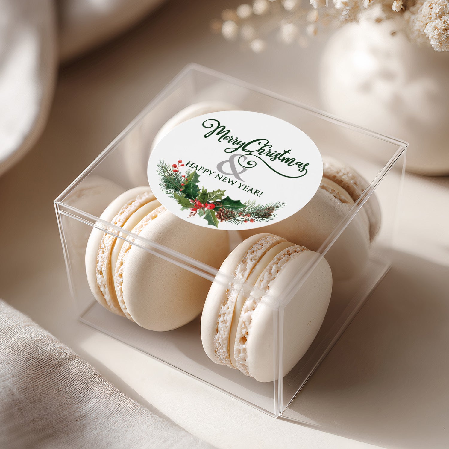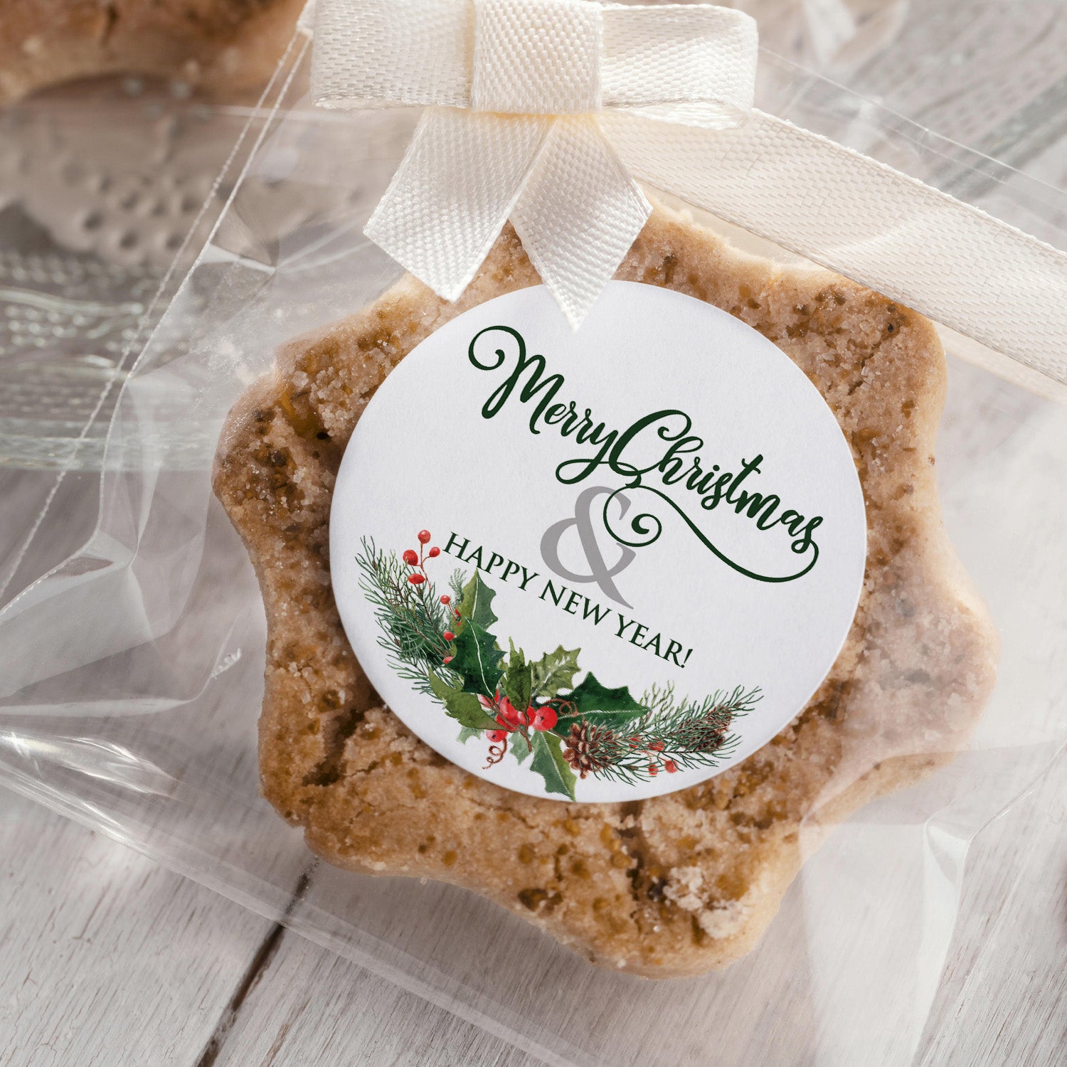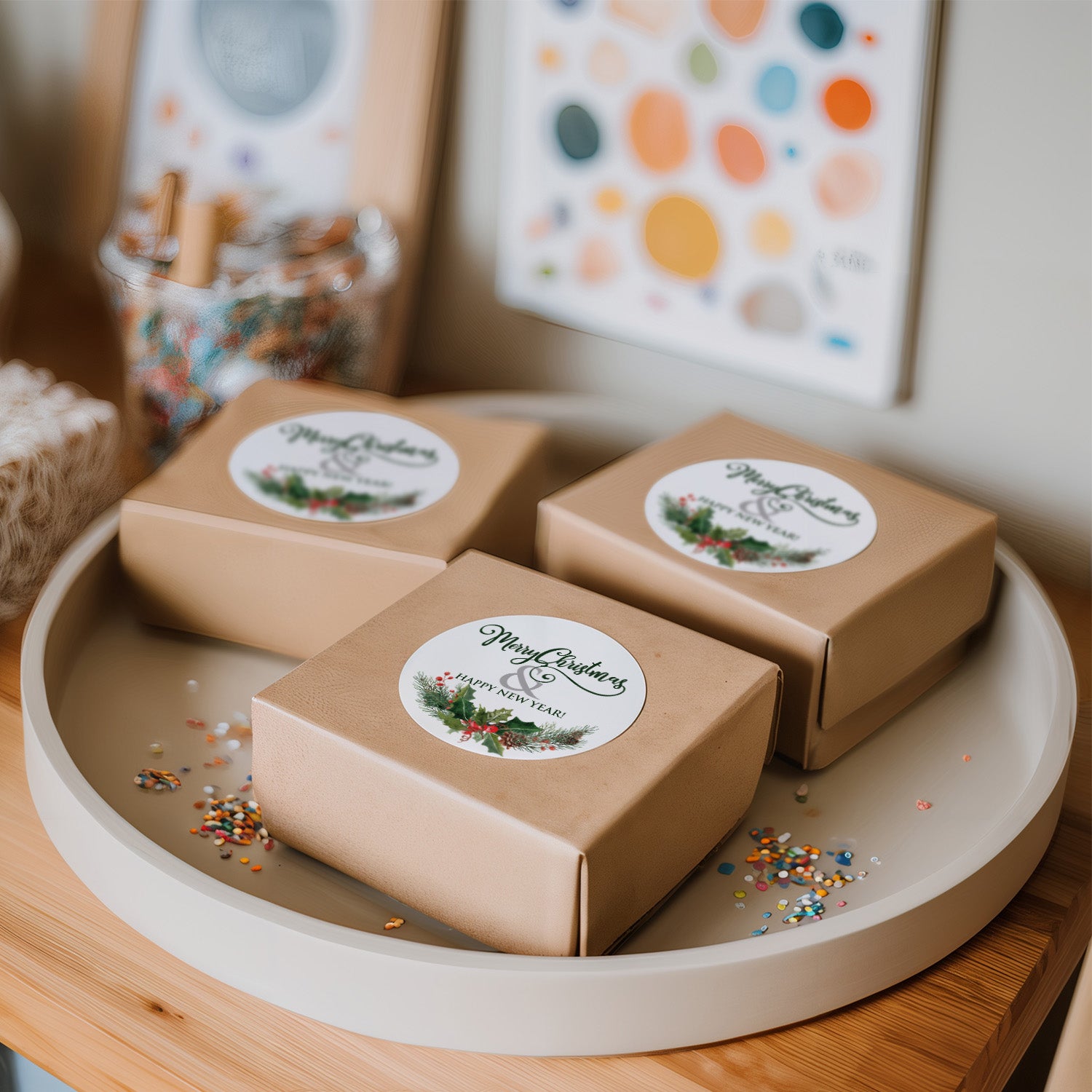 Festive Merry Christmas & Happy New Year stickers with holly, pine, and berry accents, perfect for sealing holiday gift bags, cookie packs, boxes, or envelopes. Add a cheerful seasonal touch to your packaging with these personalized holiday labels.