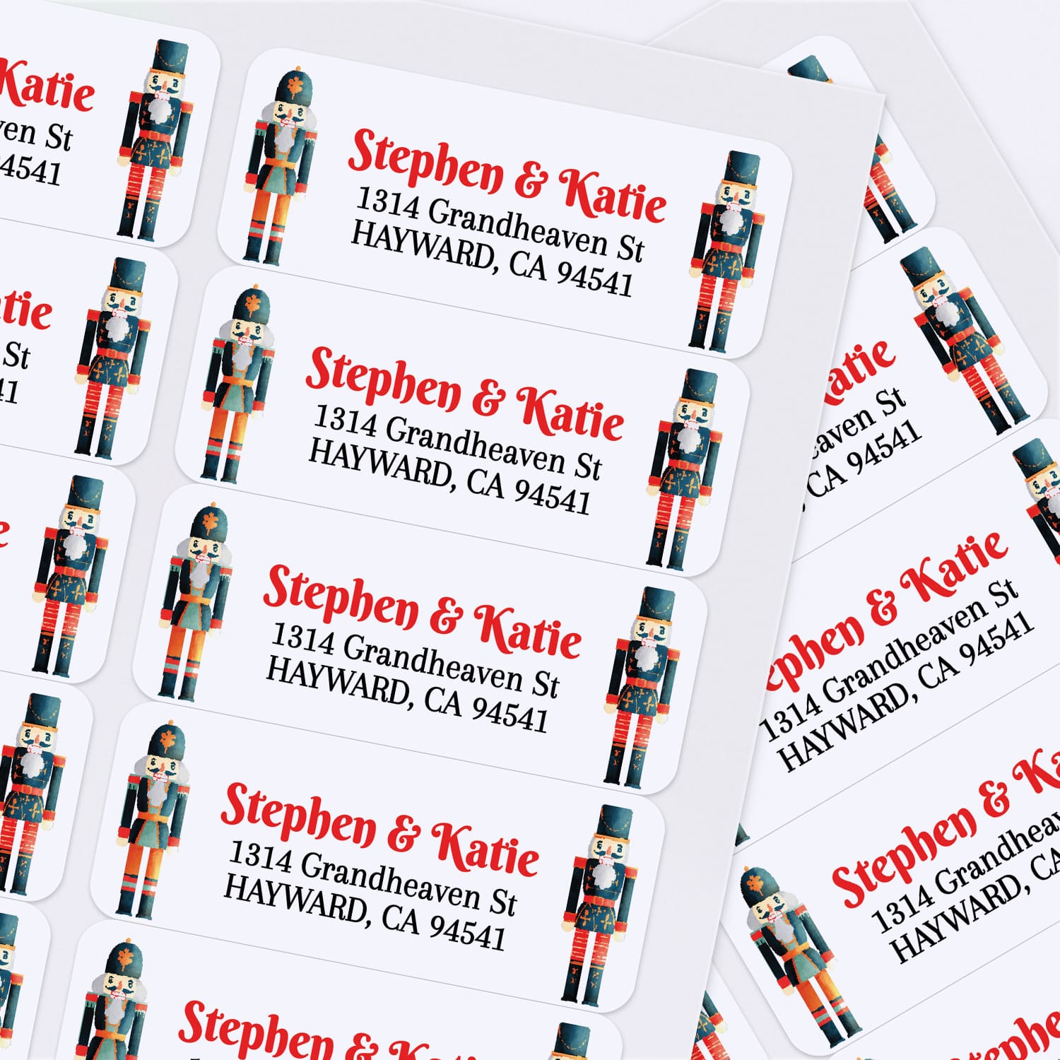 Sheet of personalized nutcracker-themed return address labels with festive soldiers and bright red text, perfect for holiday correspondence - XOXOKristen