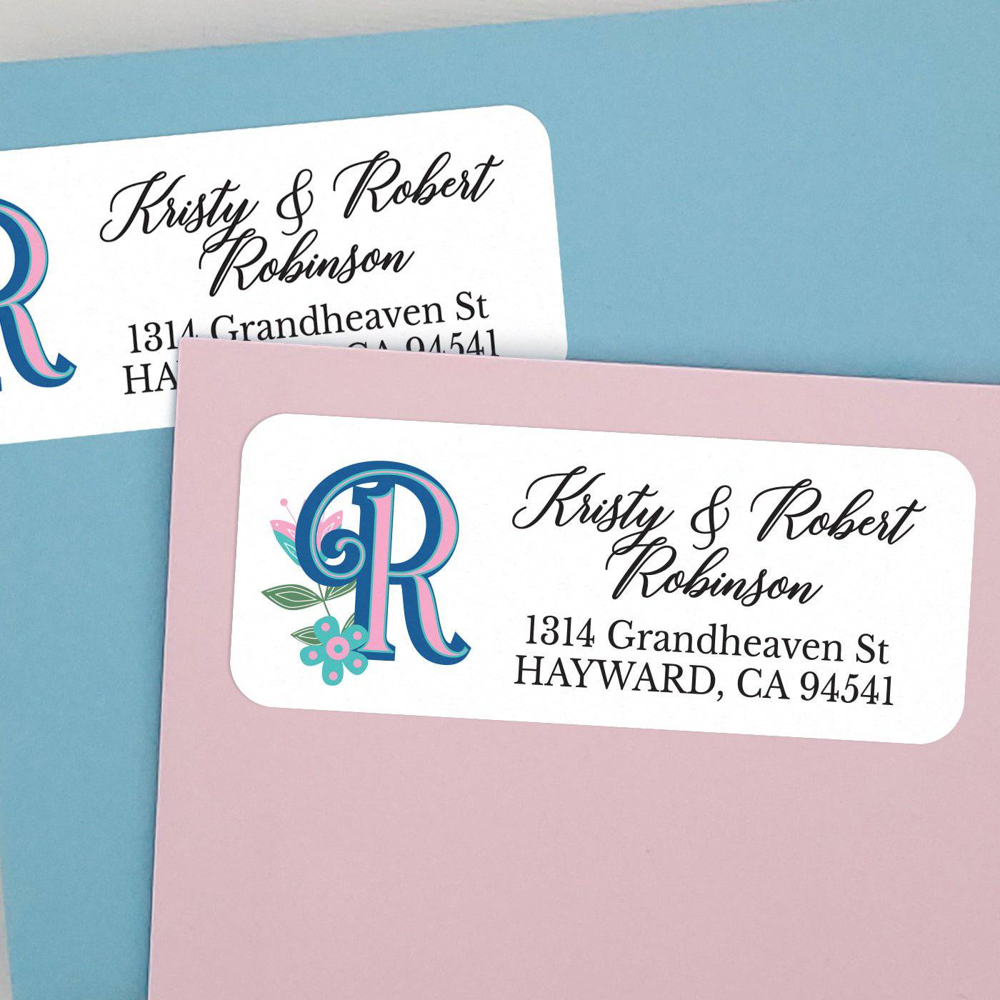 Add a refined touch to your mail with these personalized return address labels, featuring a decorative monogram “R” accented by teal and pink floral details and leafy sprigs. The initials are printed in bold blue and pink with elegant scrollwork, balanced by delicate flowers in complementary shades. Printed on high-quality adhesive paper, these custom labels ensure your envelopes and packages look polished and personal. Perfect for weddings, parties, holiday cards, or everyday correspondence.