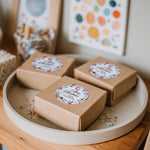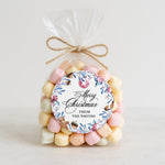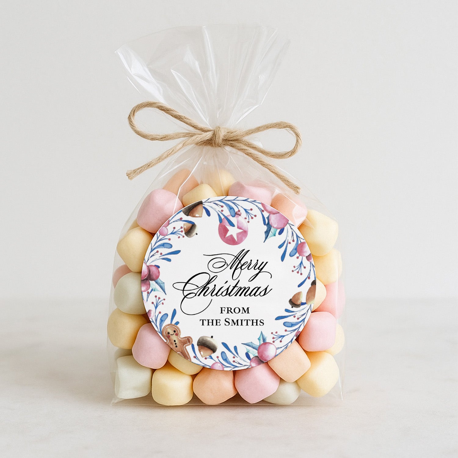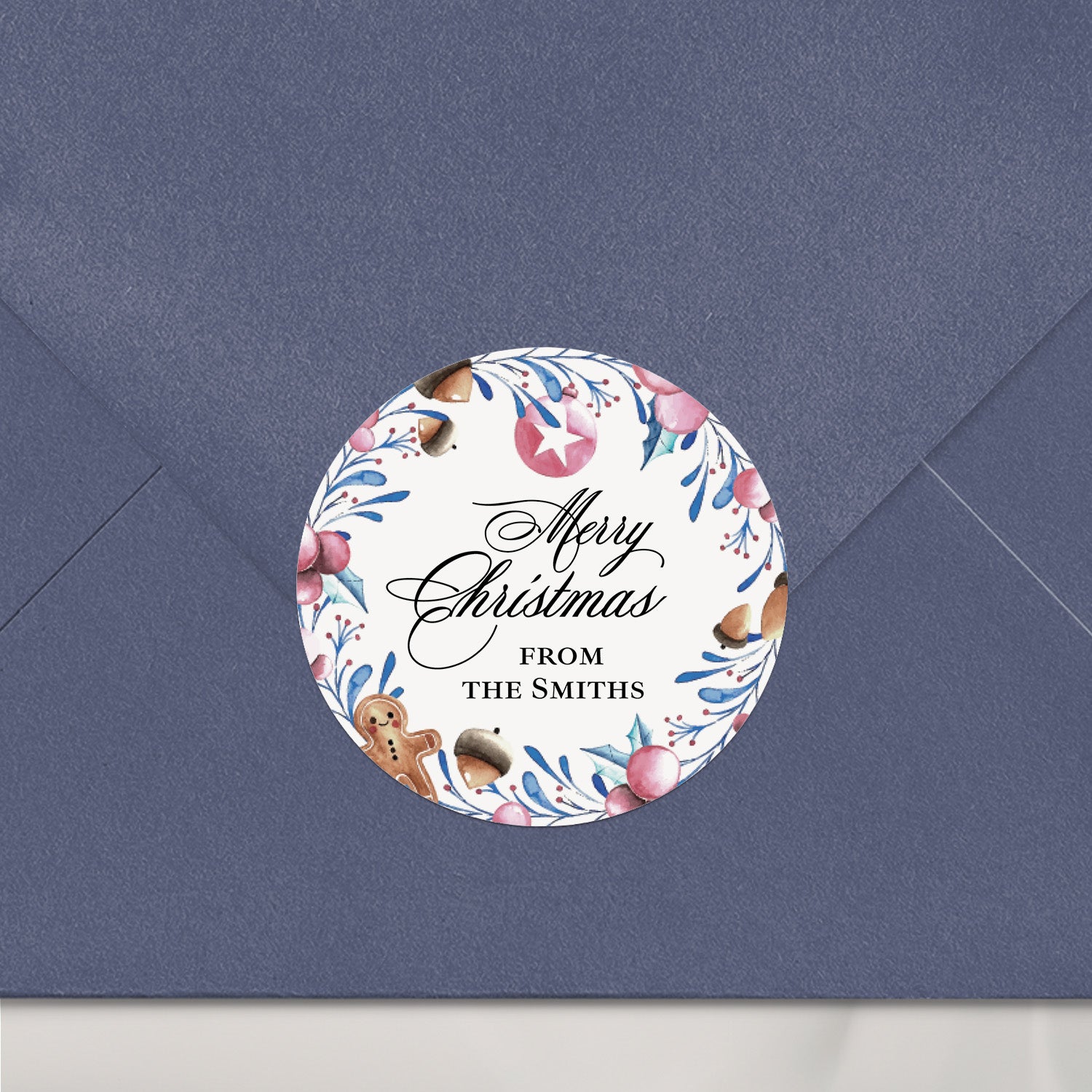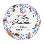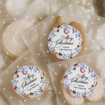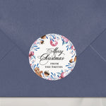 Festive Christmas stickers with watercolor illustrations of ornaments, gingerbread, pinecones, and holly branches. Personalized with your custom family name or signature line, these round holiday labels are perfect for sealing gift boxes, cookie bags, party favors, and envelopes. A charming way to add a personal touch to your Christmas celebrations.