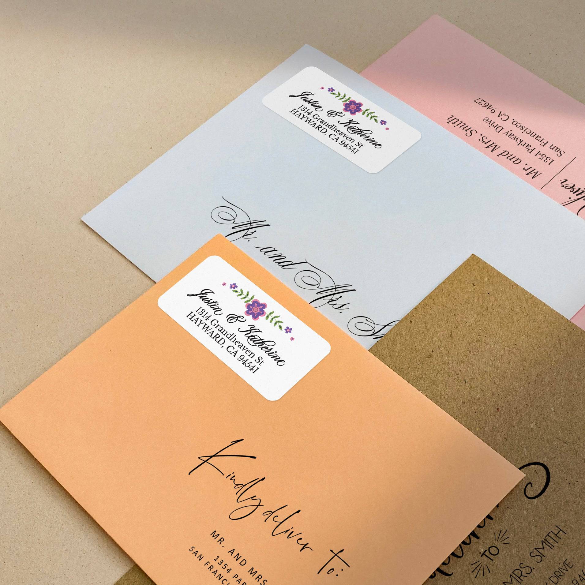 Add a stylish finishing touch to your envelopes with these personalized floral return address labels. Each label features a crisp white background with a delicate botanical design of pink and purple flowers accented by soft green leaves. The elegant black script font makes your name stand out beautifully, while the classic serif font ensures your address is clear and easy to read. Printed on durable adhesive stock, these labels are designed to peel and stick with ease, saving you time while adding personality to every piece of mail. Perfect for weddings, invitations, thank-you cards, or everyday correspondence.