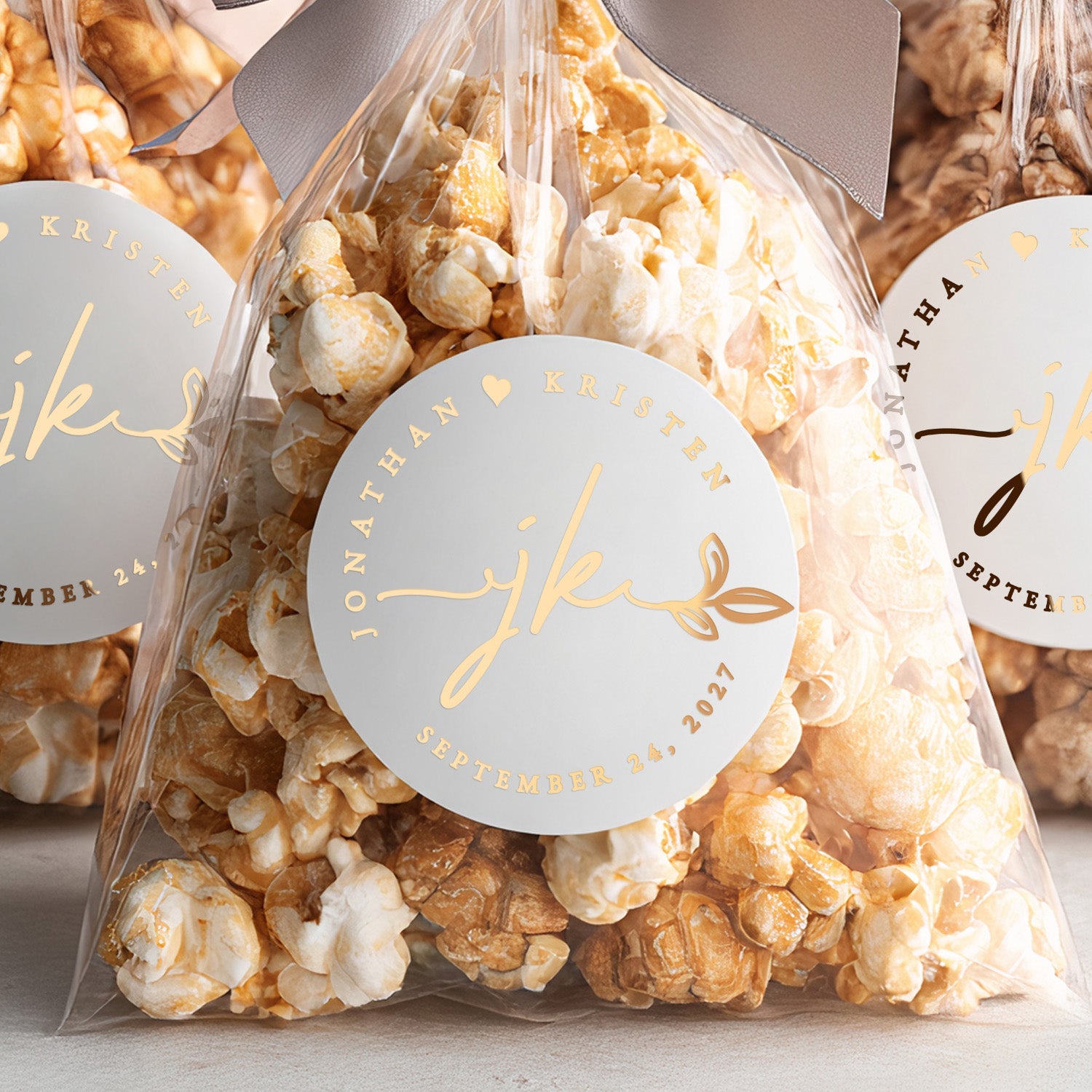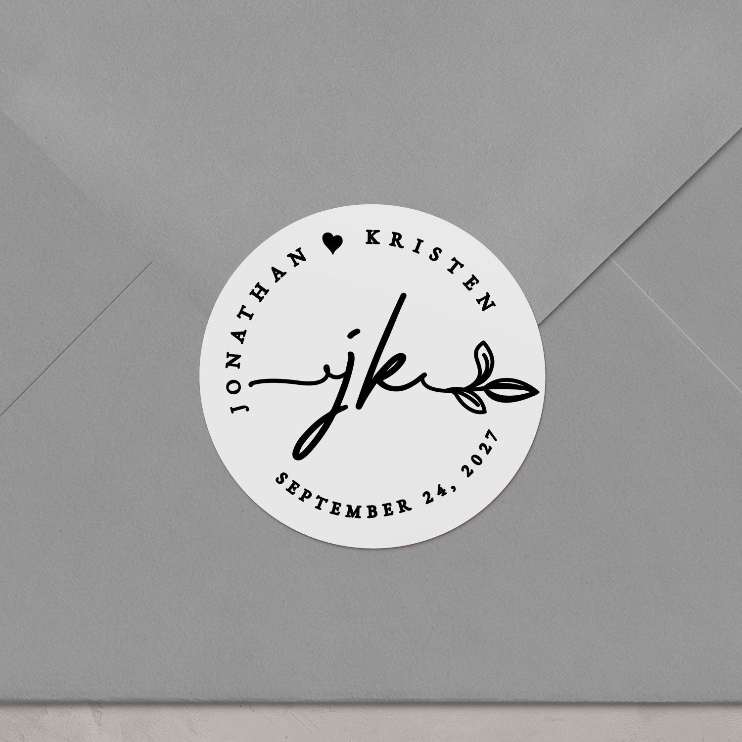 Elegant personalized wedding favor stickers featuring couple’s initials with a delicate branch accent. Perfect for sealing envelopes, favor bags, boxes, or jars, these custom stickers add a refined and memorable touch to your special day.