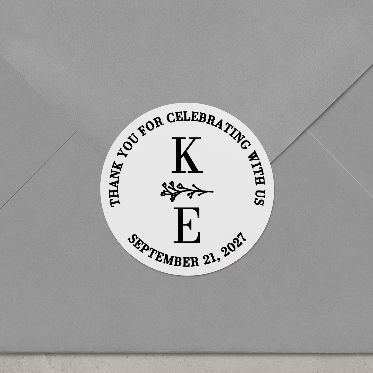 Elegant personalized wedding stickers featuring initials framed with a delicate floral accent and a circular “Thank you for celebrating with us” design. Perfect for sealing envelopes, wedding favors, gift bags, cookie packs, popcorn bags, or clear favor boxes. A timeless and versatile choice for weddings, bridal showers, anniversaries, and engagement celebrations.