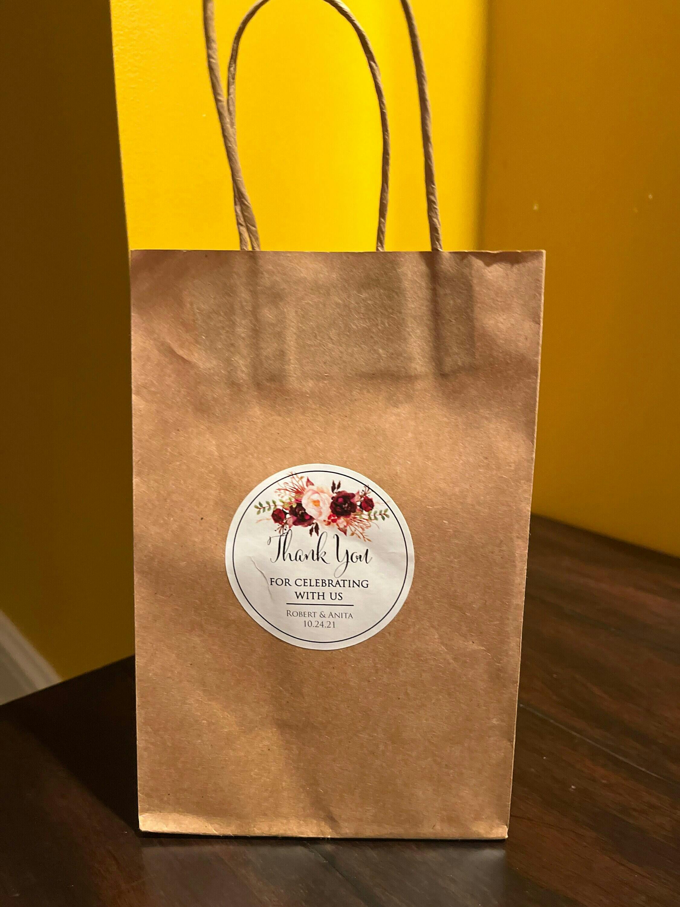 Romantic thank you stickers adorned with deep burgundy and blush watercolor florals paired with elegant calligraphy on a soft white background. These personalized round labels are ideal for sealing wedding favor bags, envelopes, cookie packs, macarons, popcorn bags, and gift boxes. A stunning finishing touch for weddings, bridal showers, and special celebrations.