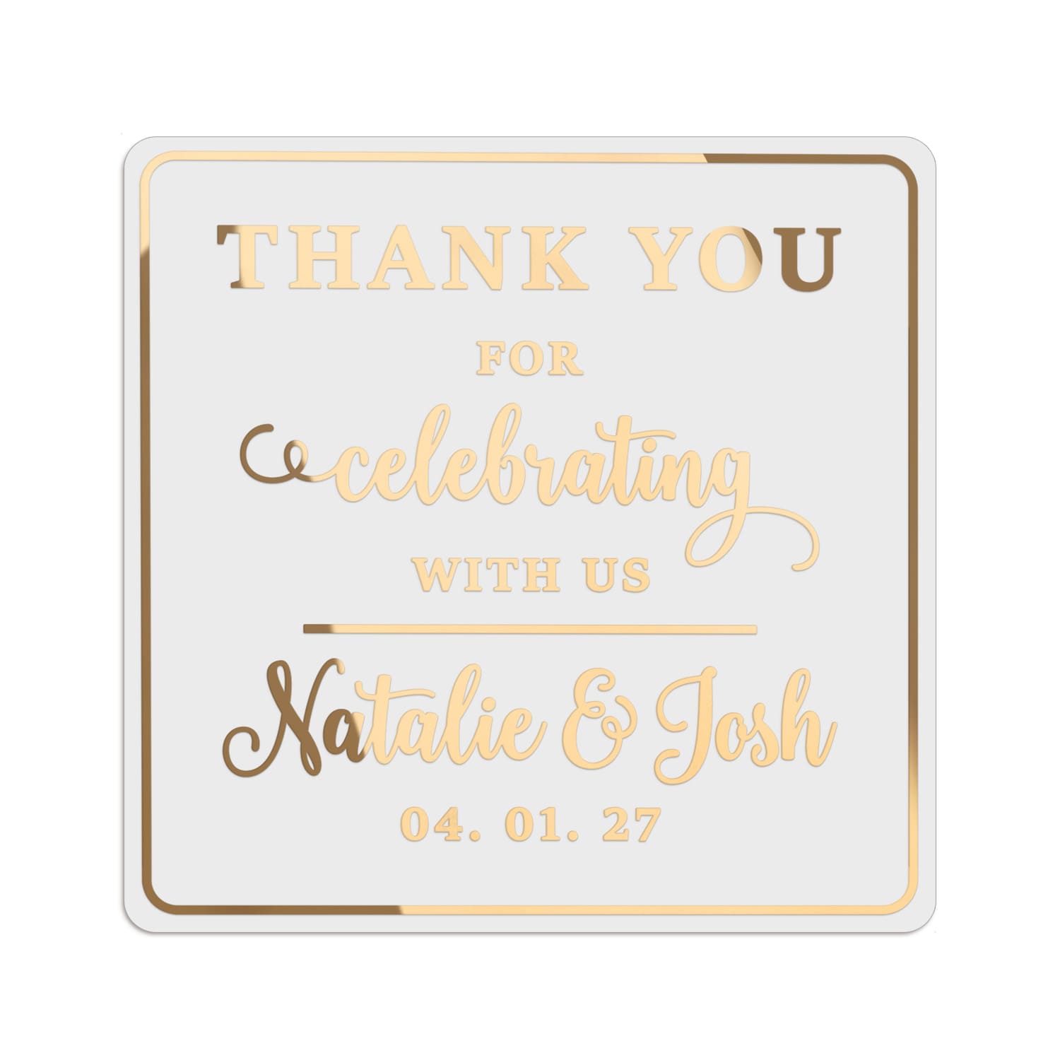Elevate your party with our personalized foiled wedding stickers, available in real gold, rose gold, silver foils. Printed on clear glossy, white matte, or white glossy vinyl, these stickers add elegance to any surface. Perfect for sealing envelopes, favor bags, cookie packs, popcorn bags, jars, gift boxes, or stick to plastic cups and glasses, they bring a luxurious touch to your event. Used for weddings, engagements, bridal showers, anniversaries, baby showers, and milestones, our durable, custom foil stickers turn every detail into something unforgettable.