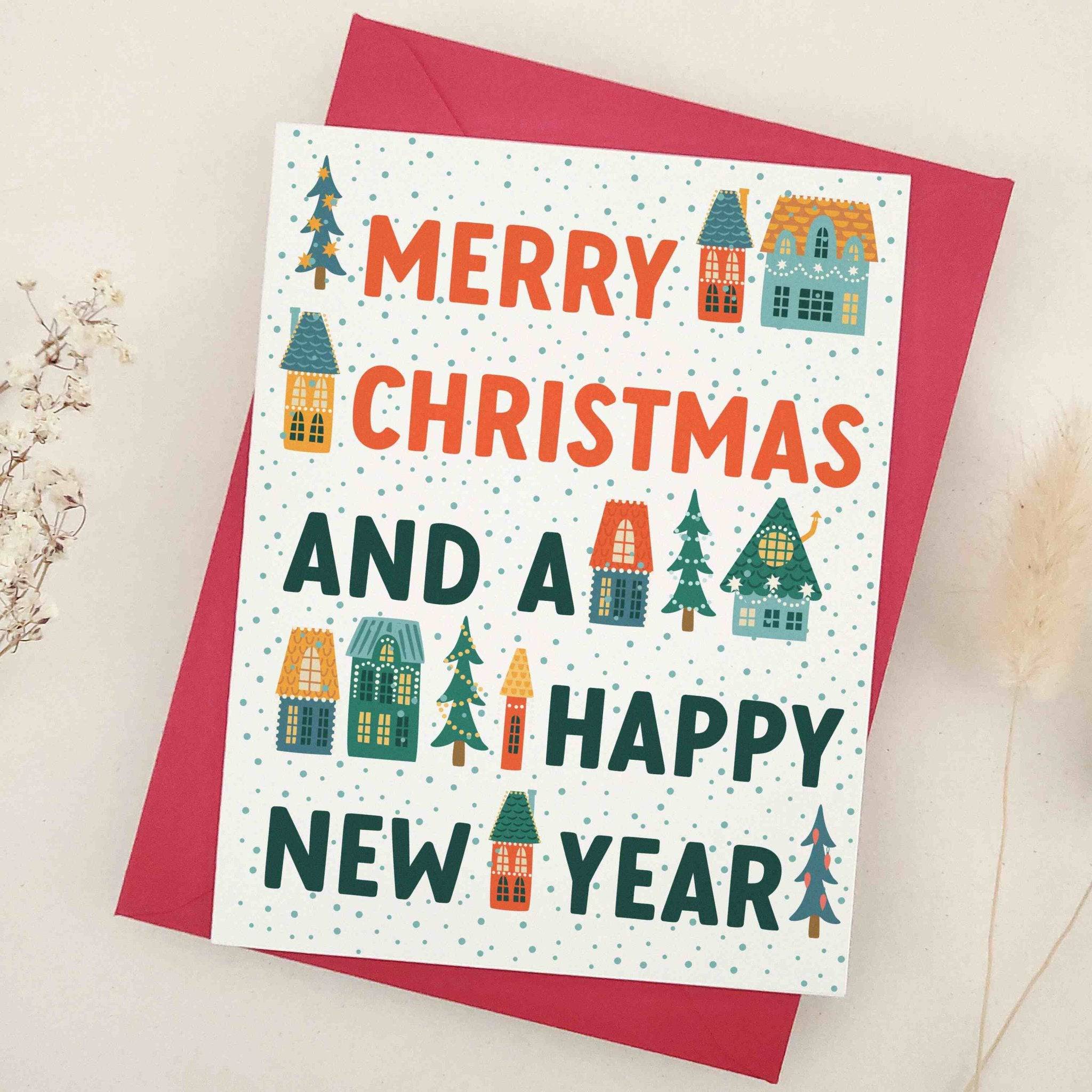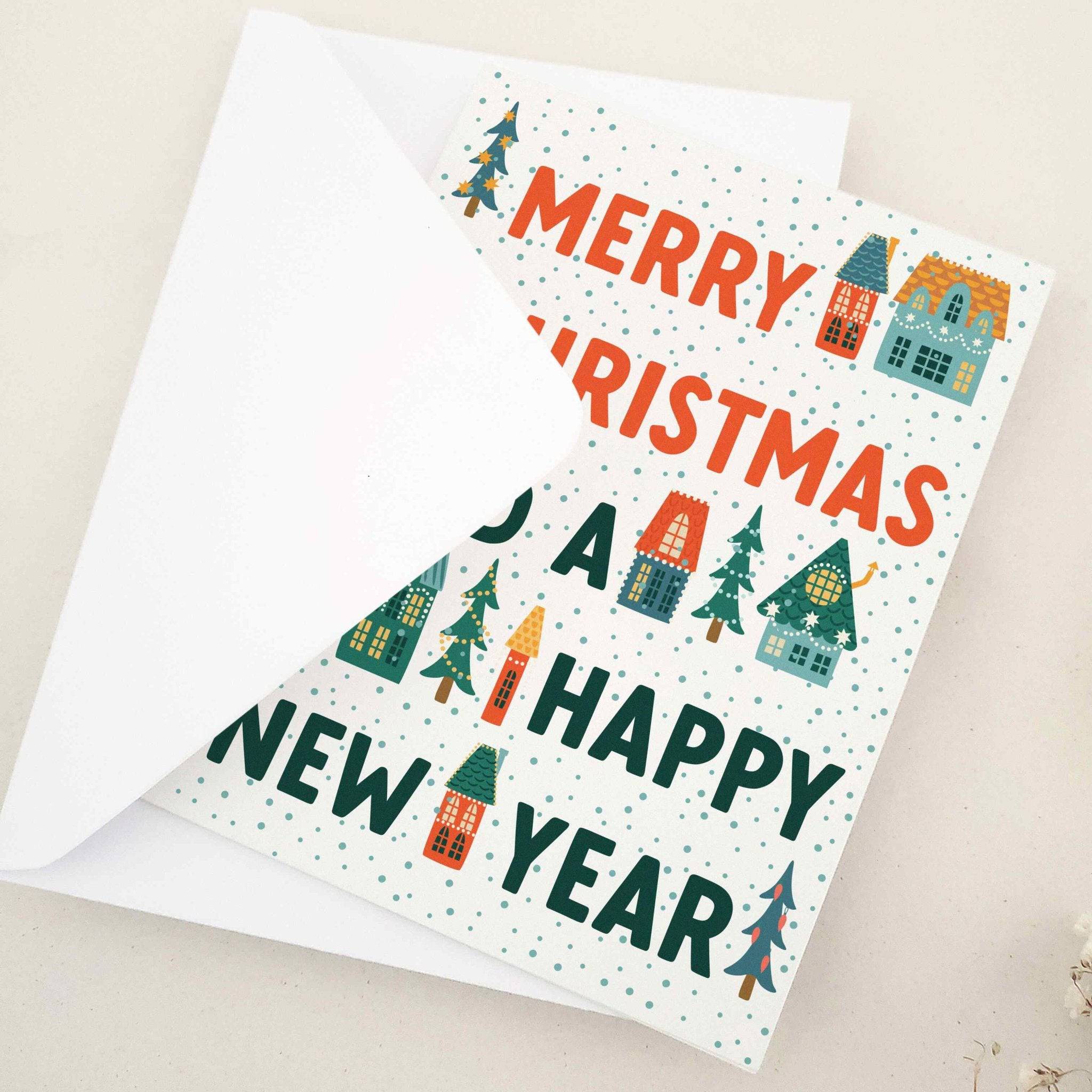Celebrate the season with this modern Merry Christmas and a Happy New Year card. The design pairs bold red and green typography with charming illustrated accents of cozy village houses, pine trees, and dotted snowfall. The playful yet stylish combination of text and seasonal motifs creates a contemporary holiday look. Each card includes a coordinating envelope in your choice of color.