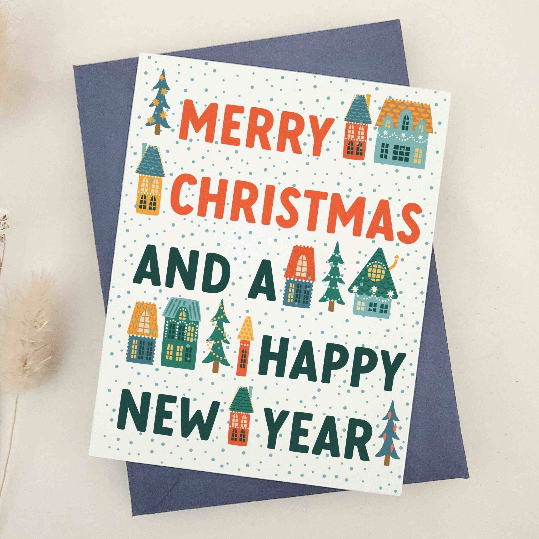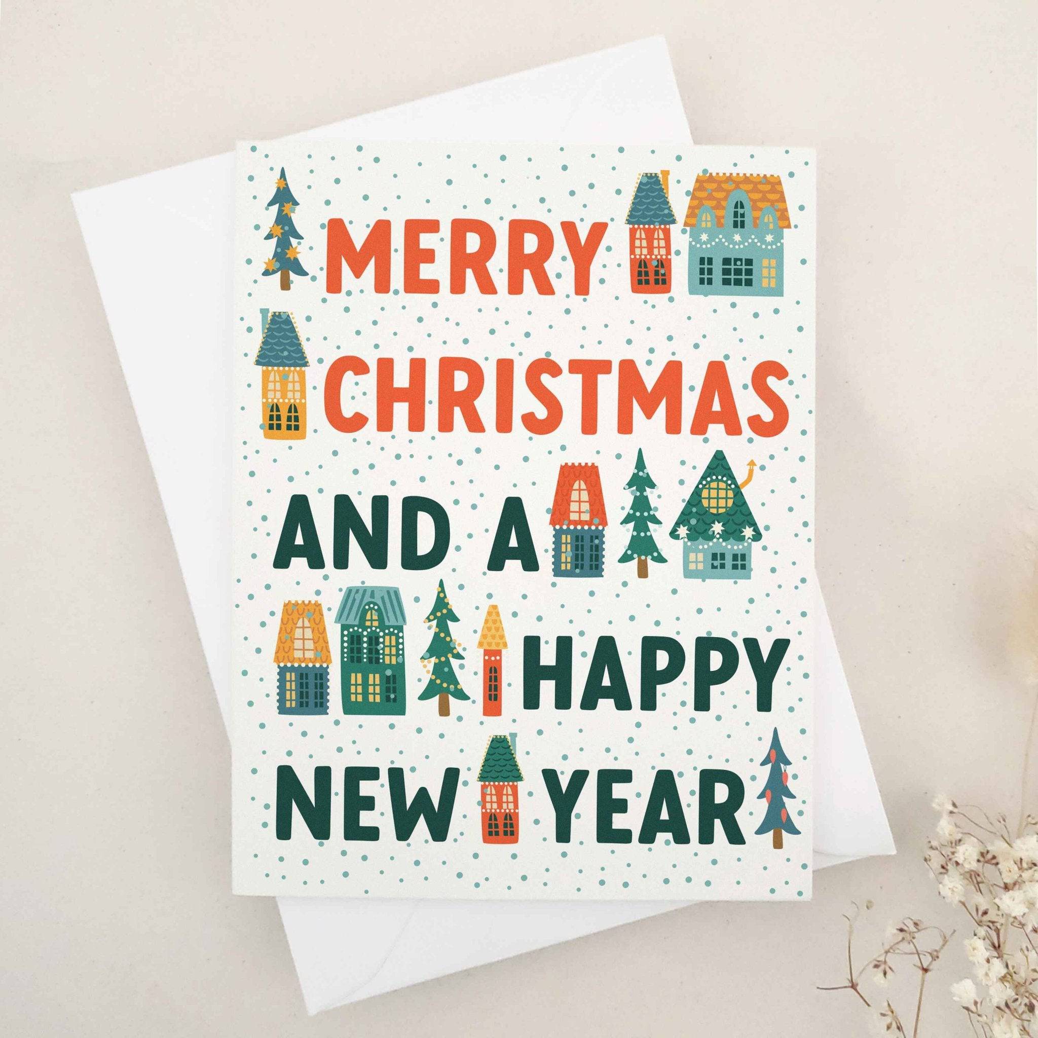 Christmas card with “Merry Christmas and a Happy New Year” in bold red and green typography, accented with small village houses, pine trees, and dotted snowfall pattern, paired with white envelope — XOXOKristen.