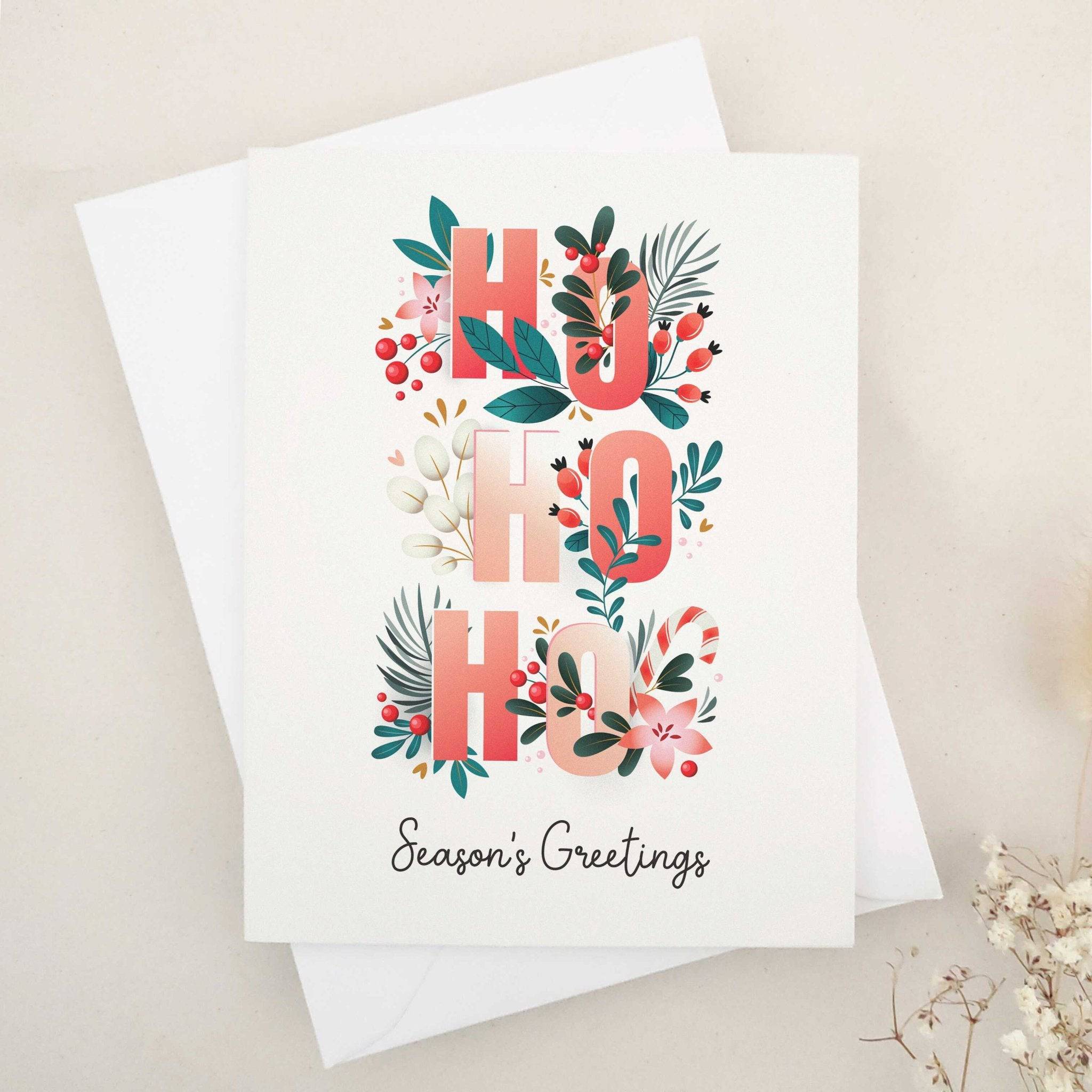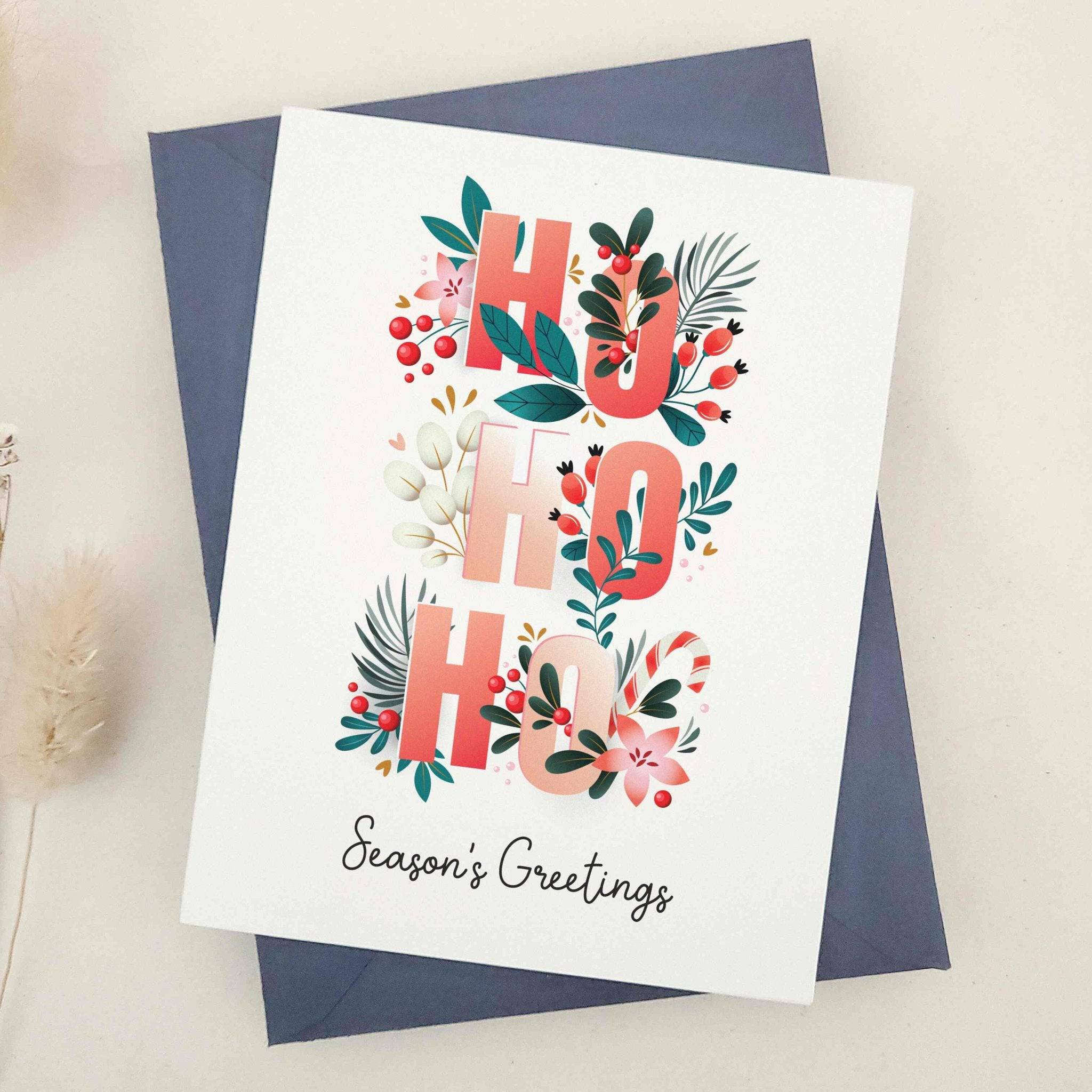 Spread holiday cheer with this elegant Christmas card, printed on slightly textured Italian off-white cardstock. The front features the cheerful phrase HO HO HO, beautifully illustrated in floral letters filled with pine sprigs, holly berries, lush greenery, and soft pink blossoms. Below, the greeting Season’s Greetings is printed in stylish black script, creating a modern yet timeless look. Each card comes with a coordinating envelope in your choice of color.