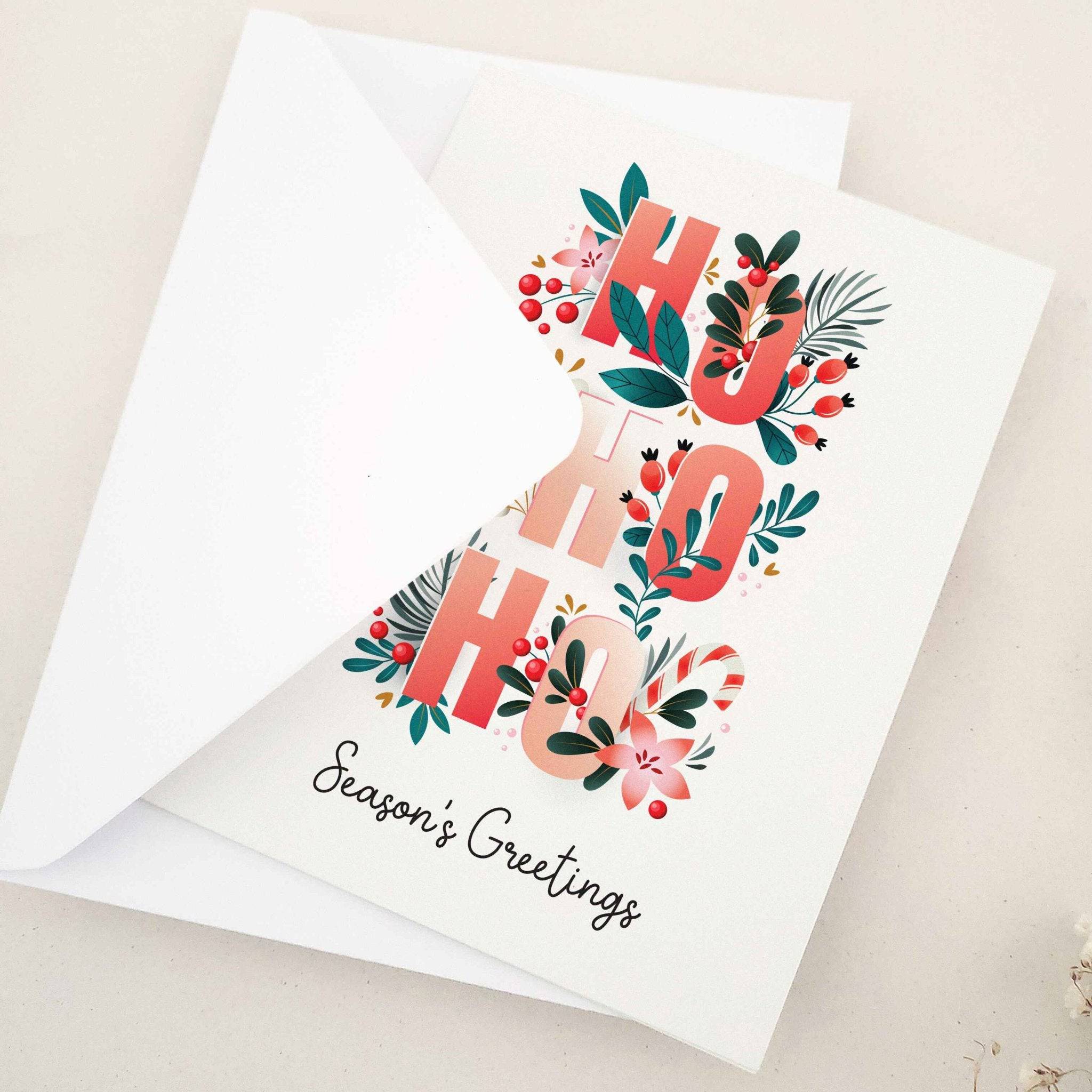 Folded Christmas card with festive “HO HO HO” floral design on off-white cardstock, shown with matching envelope — XOXOKristen.