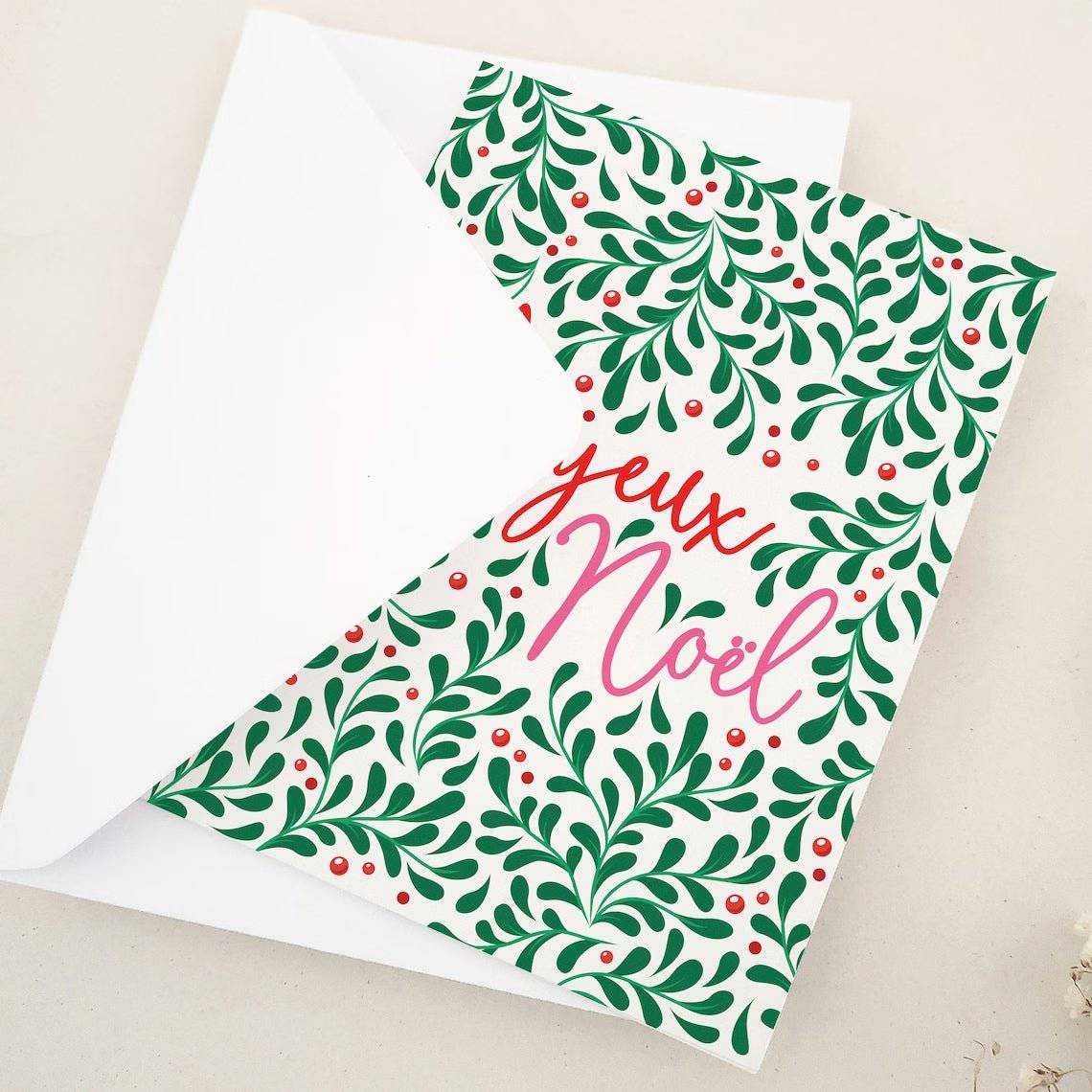 ♥ French Christmas card with bold red “Joyeux Noël” text, surrounded by a full-coverage green leaf and red berry pattern.