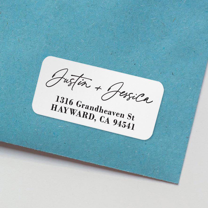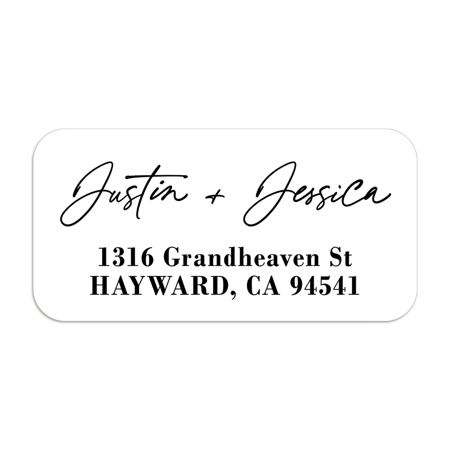 Upgrade your stationery with personalized script return address labels, featuring romantic handwritten-style names paired with a classic serif font for address lines. Printed in sharp black ink on crisp white labels with rounded corners, this design blends modern elegance with timeless readability.