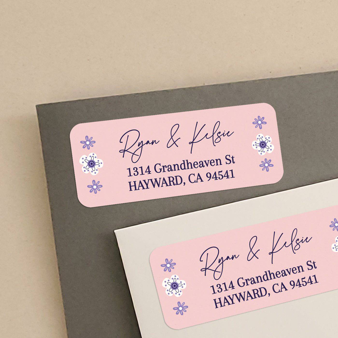 These personalized return address labels feature a blush pink background decorated with playful purple floral illustrations. Designed with modern script typography, the labels balance elegance with a cheerful touch. Perfect for weddings, baby showers, parties, or daily correspondence, these custom stickers bring a vibrant and stylish finish to your envelopes and packages.