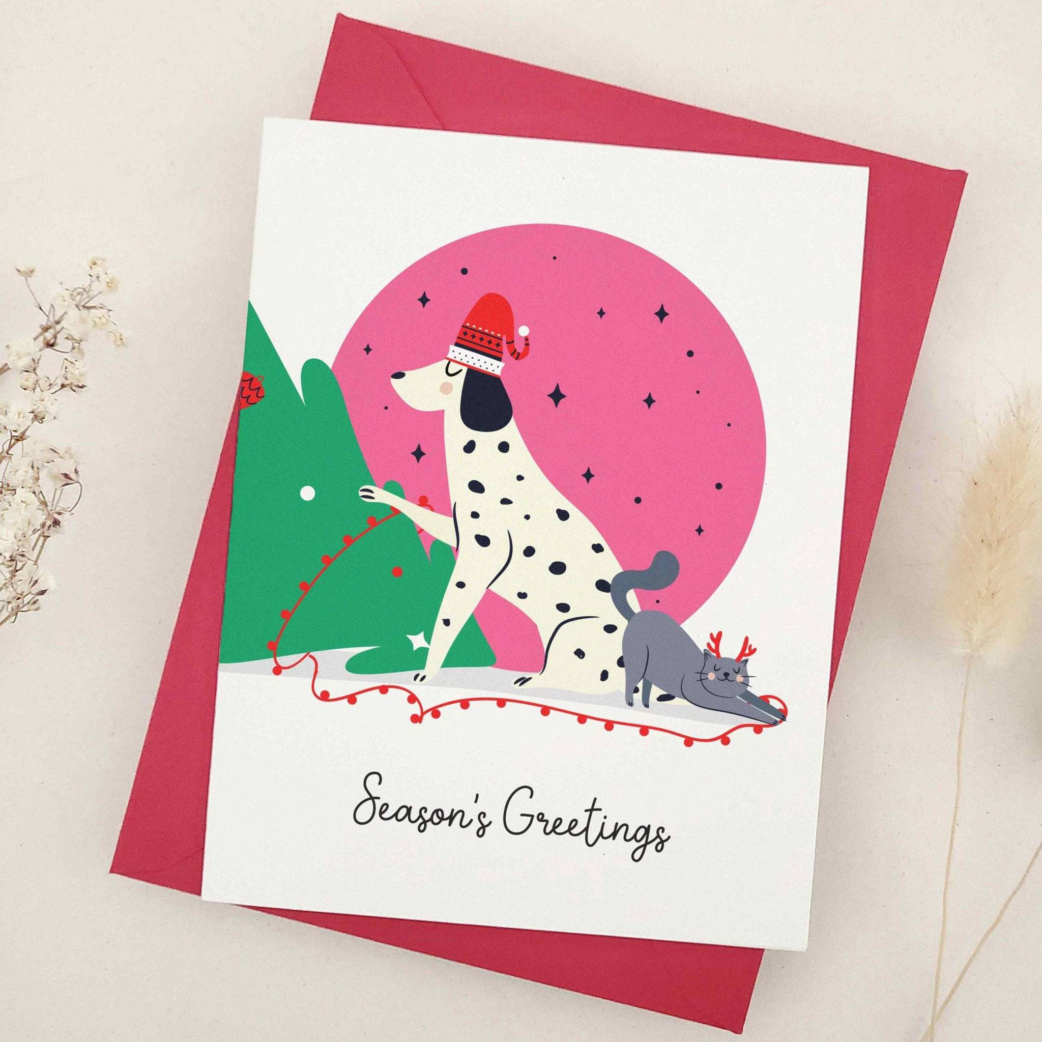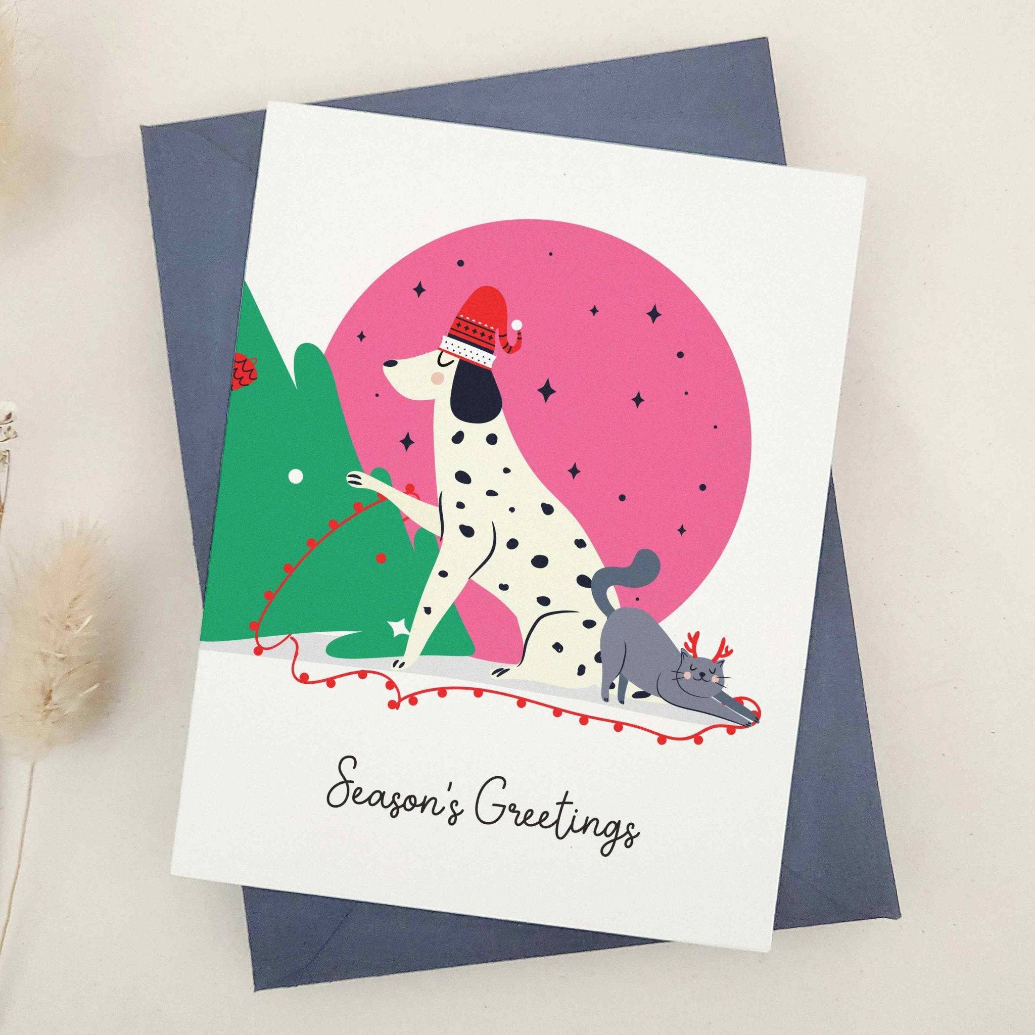 ♥  A modern Christmas illustration of a spotted Dalmatian dog in a winter hat sitting with a cat wrapped in string lights under a pink festive moon and green Christmas tree, with the greeting "Season’s Greetings” below.