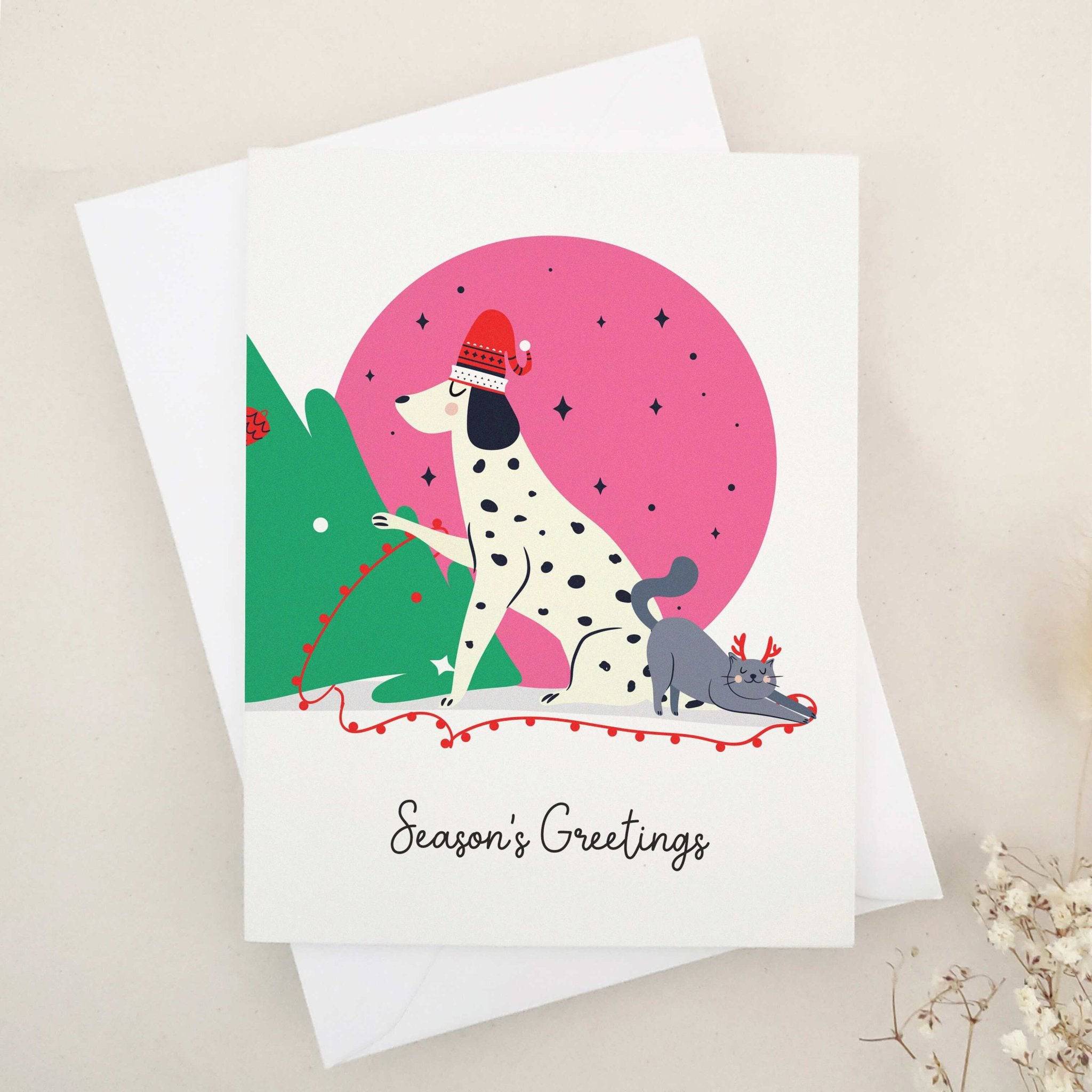 Season’s Greetings Christmas card featuring Dalmatian dog and cat illustration with festive design – XOXOKristen