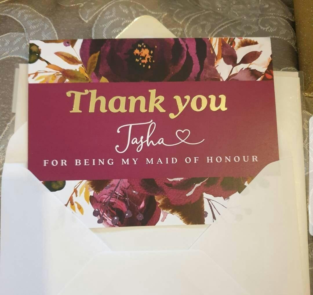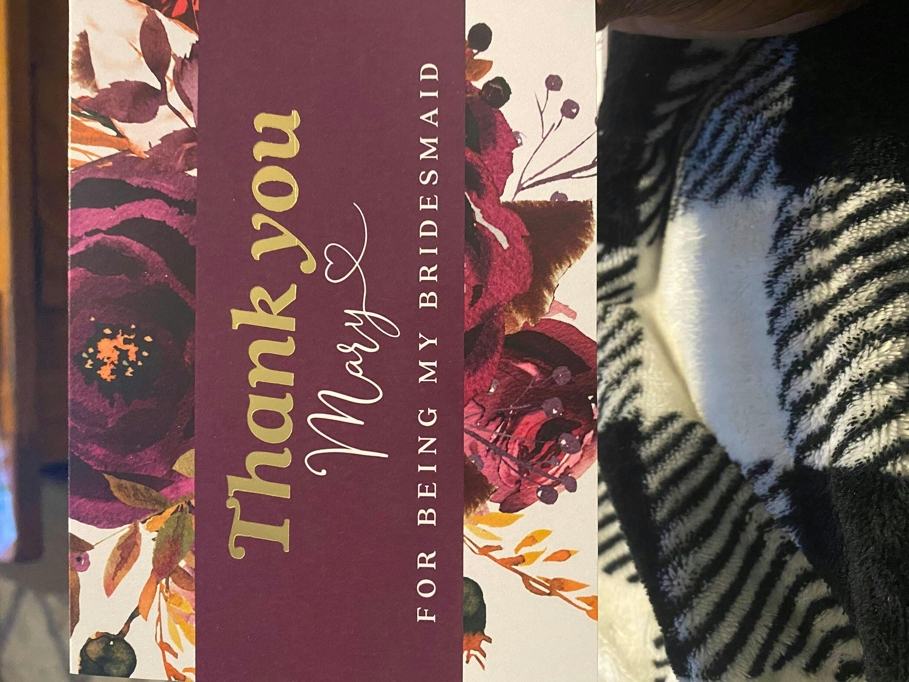 This personalized Plum Floral Thank you for being my bridesmaid card with foil pressed gold "Thank you" is the perfect way to express how much your friends and family means to you. The card is available for bridesmaid, maid of honor, matron of honor, flower girl and actually any wedding role you might have in mind! Just click on the "Custom" role button and input the desired custom role.