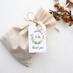 XOXOKristen Eucalyptus Thank You Tags tied with natural twine onto a linen favor bag, showing the delicate printed “Thank you” text below the greenery wreath for a rustic botanical presentation.